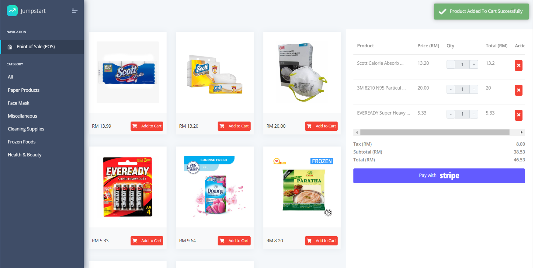 Once a customer login, customer main dashboard is the POS. Customer can add products, add quantity or reduce quantity for their chosen items in the cart. Stripe payment features allows customer to make payments on their selected items and can see a confirmation in their purchase. Sales purchase receipt can be generated into PDF format.